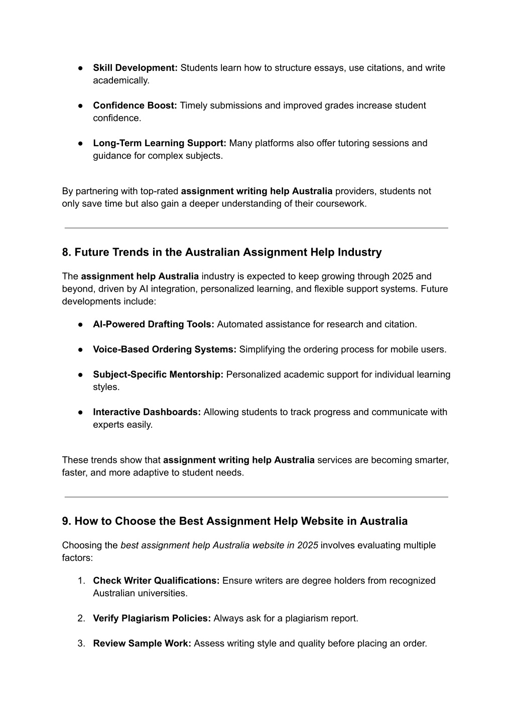 ● Skill Development: Students learn how to structure essays, use citations, and write academically. ● Confidence Boost: Timely submissions and improved grades increase student confidence. ● Long-Term Learning Support: Many platforms also offer tutoring sessions and guidance for complex subjects. By partnering with top-rated assignment writing help Australia providers, students not only save time but also gain a deeper understanding of their coursework. 8. Future Trends in the Australian Assignment Help Industry The assignment help Australia industry is expected to keep growing through 2025 and beyond, driven by AI integration, personalized learning, and flexible support systems. Future developments include: ● AI-Powered Drafting Tools: Automated assistance for research and citation. ● Voice-Based Ordering Systems: Simplifying the ordering process for mobile users. ● Subject-Specific Mentorship: Personalized academic support for individual learning styles. ● Interactive Dashboards: Allowing students to track progress and communicate with experts easily. These trends show that assignment writing help Australia services are becoming smarter, faster, and more adaptive to student needs. 9. How to Choose the Best Assignment Help Website in Australia Choosing the best assignment help Australia website in 2025 involves evaluating multiple factors: 1. Check Writer Qualifications: Ensure writers are degree holders from recognized Australian universities. 2. Verify Plagiarism Policies: Always ask for a plagiarism report. 3. Review Sample Work: Assess writing style and quality before placing an order.