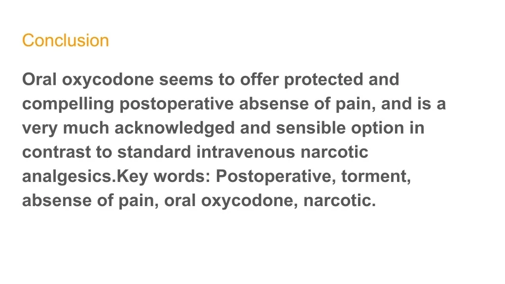 Conclusion Oral oxycodone seems to offer protected and compelling postoperative absense of pain, and is a very much acknowledged and sensible option in contrast to standard intravenous narcotic analgesics.Key words: Postoperative, torment, absense of pain, oral oxycodone, narcotic.