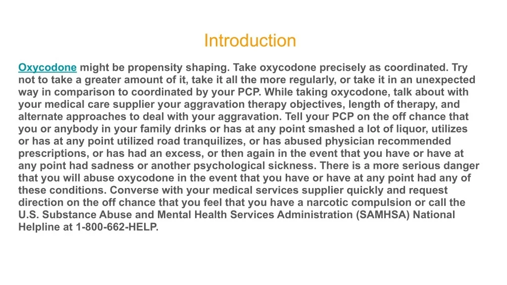 Introduction Oxycodone might be propensity shaping. Take oxycodone precisely as coordinated. Try not to take a greater amount of it, take it all the more regularly, or take it in an unexpected way in comparison to coordinated by your PCP. While taking oxycodone, talk about with your medical care supplier your aggravation therapy objectives, length of therapy, and alternate approaches to deal with your aggravation. Tell your PCP on the off chance that you or anybody in your family drinks or has at any point smashed a lot of liquor, utilizes or has at any point utilized road tranquilizes, or has abused physician recommended prescriptions, or has had an excess, or then again in the event that you have or have at any point had sadness or another psychological sickness. There is a more serious danger that you will abuse oxycodone in the event that you have or have at any point had any of these conditions. Converse with your medical services supplier quickly and request direction on the off chance that you feel that you have a narcotic compulsion or call the U.S. Substance Abuse and Mental Health Services Administration (SAMHSA) National Helpline at 1-800-662-HELP.