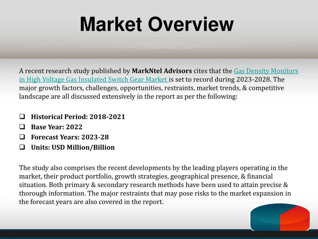 Market Overview A recent research study published by MarkNtel Advisors cites that the Gas Density Monitors in High Voltage Gas Insulated Switch Gear Market is set to record during 2023-2028. The major growth factors, challenges, opportunities, restraints, market trends, & competitive landscape are all discussed extensively in the report as per the following: • Historical Period: 2018-2021 • Base Year: 2022 • Forecast Years: 2023-28 • Units: USD Million/Billion The study also comprises the recent developments by the leading players operating in the market, their product portfolio, growth strategies, geographical presence, & financial situation. Both primary & secondary research methods have been used to attain precise & thorough information. The major restraints that may pose risks to the market expansion in the forecast years are also covered in the report.