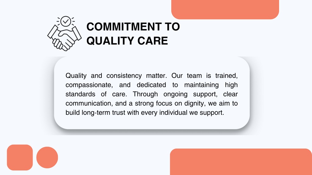 COMMITMENT TO QUALITY CARE Quality and consistency matter. Our team is trained, compassionate, and dedicated to maintaining high standards of care. Through ongoing support, clear communication, and a strong focus on dignity, we aim to build long-term trust with every individual we support.