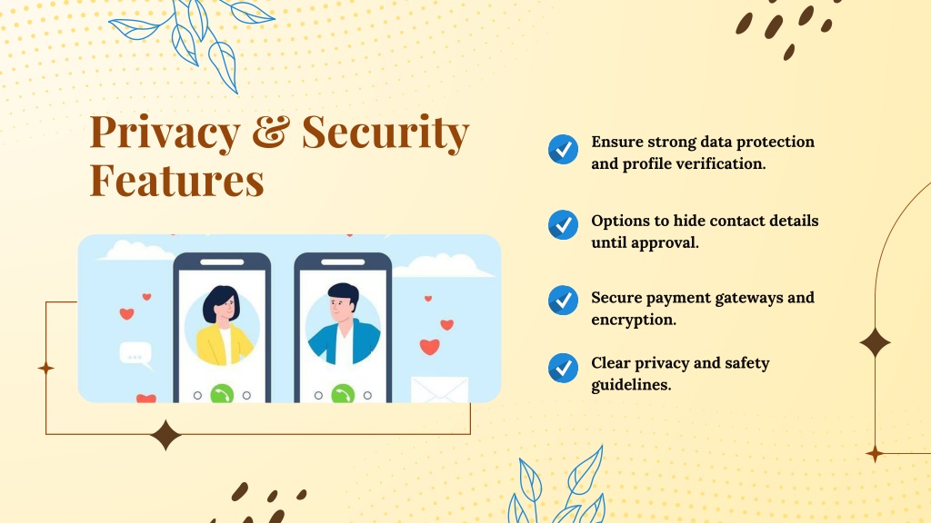 Privacy & Security Features Ensure strong data protection and profile verification. Options to hide contact details until approval. Secure payment gateways and encryption. Clear privacy and safety guidelines.