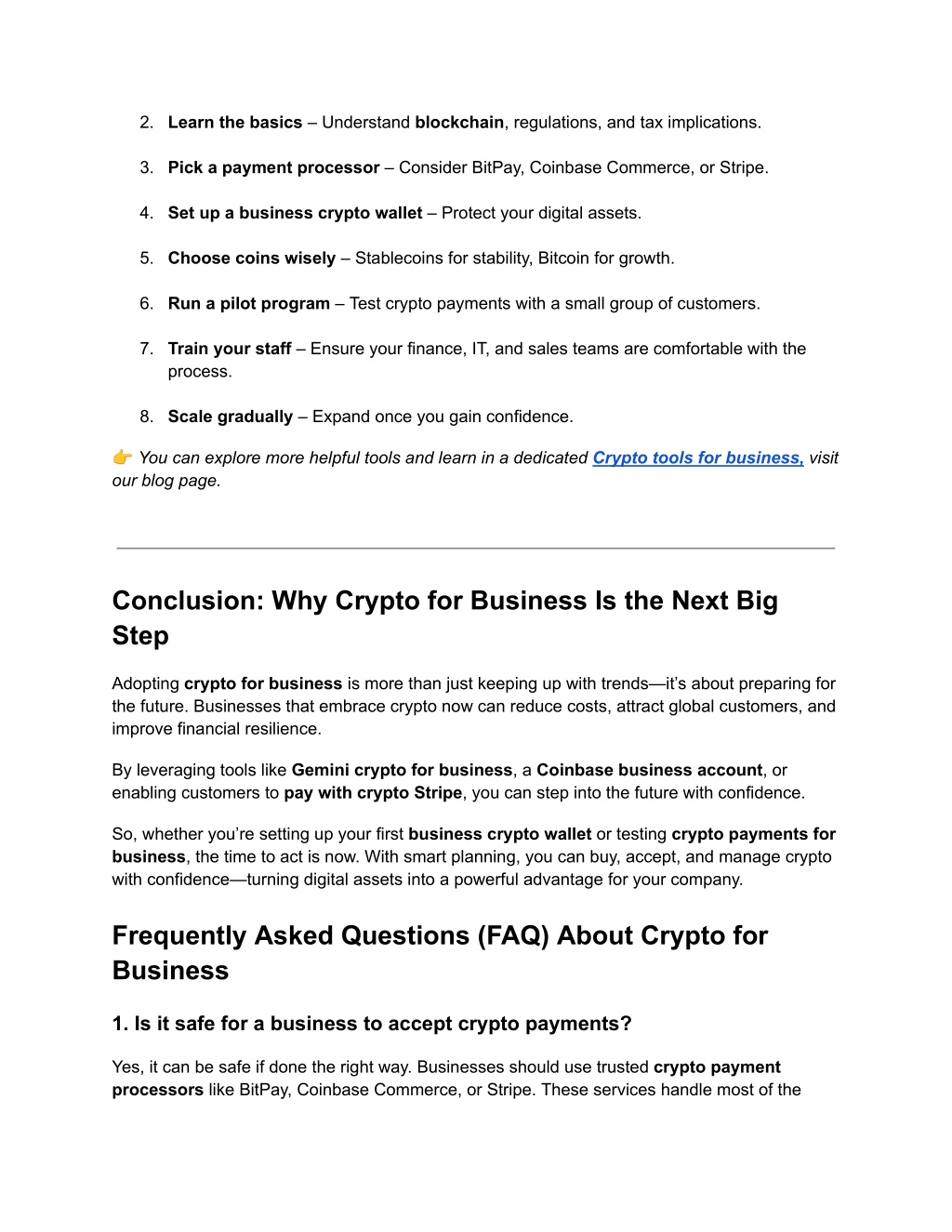 2. Learn the basics – Understand blockchain, regulations, and tax implications. 3. Pick a payment processor – Consider BitPay, Coinbase Commerce, or Stripe. 4. Set up a business crypto wallet – Protect your digital assets. 5. Choose coins wisely – Stablecoins for stability, Bitcoin for growth. 6. Run a pilot program – Test crypto payments with a small group of customers. 7. Train your staff – Ensure your finance, IT, and sales teams are comfortable with the process. 8. Scale gradually – Expand once you gain confidence. ?You can explore more helpful tools and learn in a dedicated Crypto tools for business, visit our blog page. Conclusion: Why Crypto for Business Is the Next Big Step Adopting crypto for business is more than just keeping up with trends—it’s about preparing for the future. Businesses that embrace crypto now can reduce costs, attract global customers, and improve financial resilience. By leveraging tools like Gemini crypto for business, a Coinbase business account, or enabling customers to pay with crypto Stripe, you can step into the future with confidence. So, whether you’re setting up your first business crypto wallet or testing crypto payments for business, the time to act is now. With smart planning, you can buy, accept, and manage crypto with confidence—turning digital assets into a powerful advantage for your company. Frequently Asked Questions (FAQ) About Crypto for Business 1. Is it safe for a business to accept crypto payments? Yes, it can be safe if done the right way. Businesses should use trusted crypto payment processors like BitPay, Coinbase Commerce, or Stripe. These services handle most of the