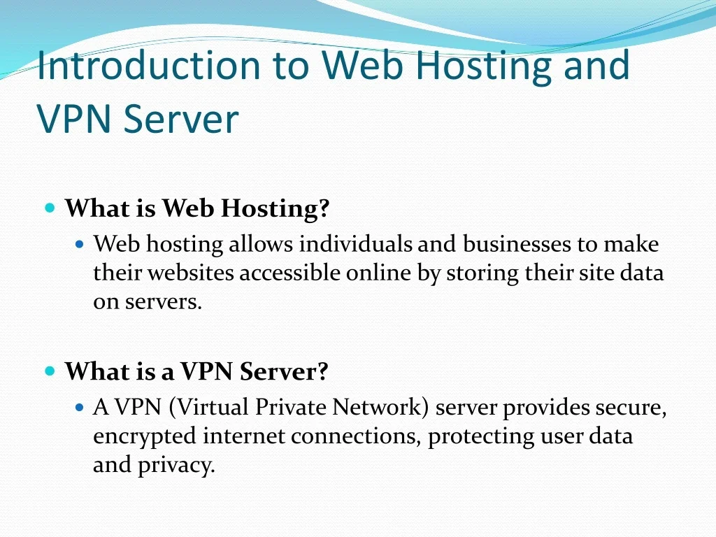 Introduction to Web Hosting and VPN Server • What is Web Hosting? • Web hosting allows individuals and businesses to make their websites accessible online by storing their site data on servers. • What is a VPN Server? • A VPN (Virtual Private Network) server provides secure, encrypted internet connections, protecting user data and privacy.
