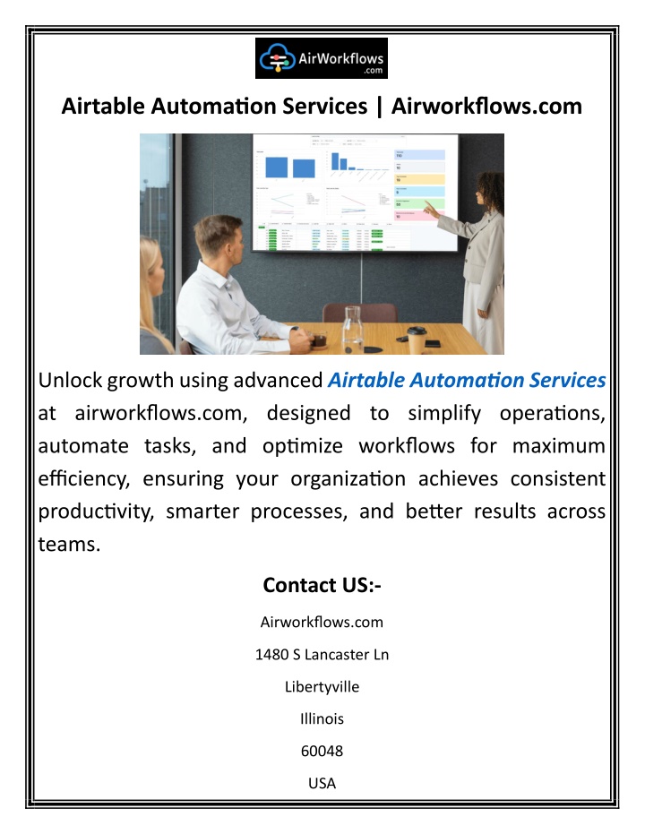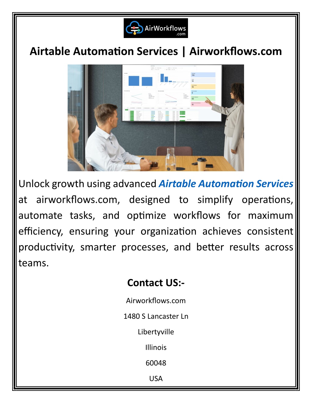 Airtable Automation Services | Airworkflows.com Unlock growth using advanced Airtable Automation Services at airworkflows.com, designed to simplify operations, automate tasks, and optimize workflows for maximum efficiency, ensuring your organization achieves consistent productivity, smarter processes, and better results across teams. Contact US:- Airworkflows.com 1480 S Lancaster Ln Libertyville Illinois 60048 USA