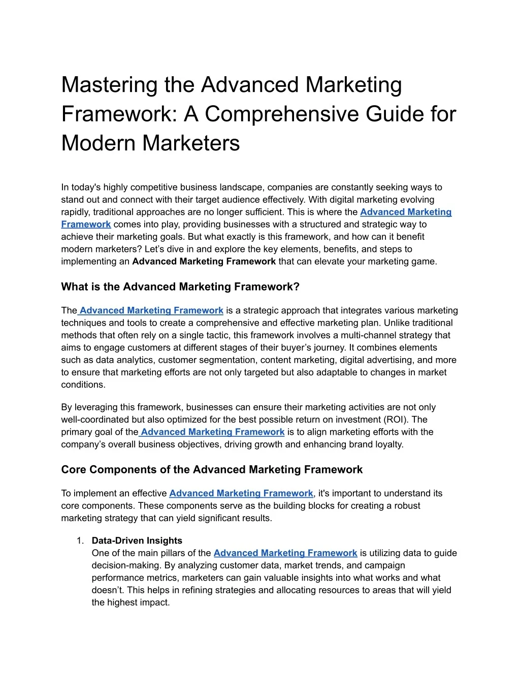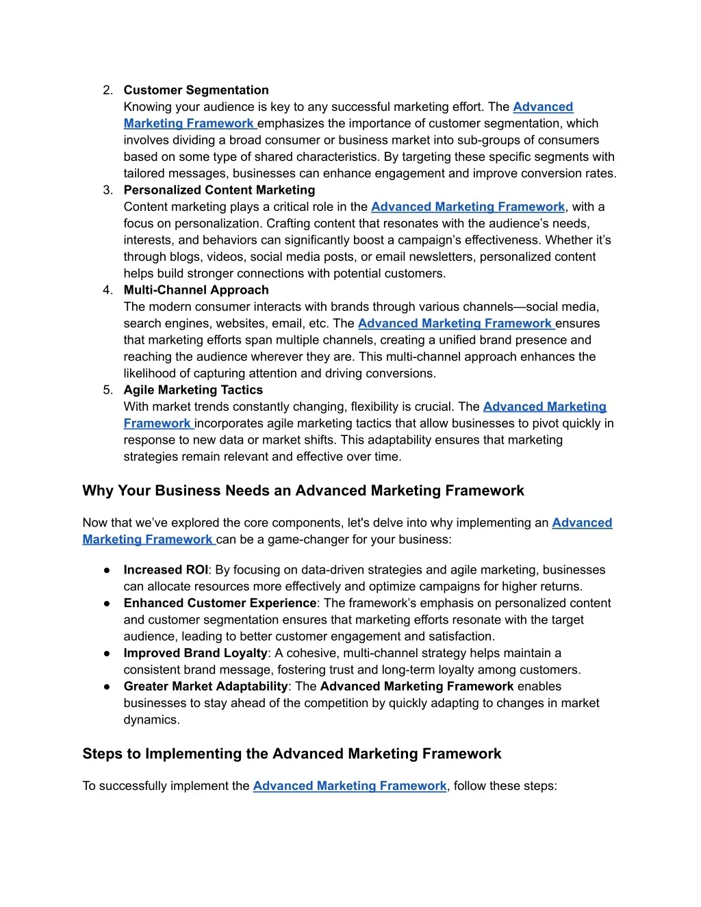 2. Customer Segmentation Knowing your audience is key to any successful marketing effort. The Advanced Marketing Framework emphasizes the importance of customer segmentation, which involves dividing a broad consumer or business market into sub-groups of consumers based on some type of shared characteristics. By targeting these specific segments with tailored messages, businesses can enhance engagement and improve conversion rates. 3. Personalized Content Marketing Content marketing plays a critical role in the Advanced Marketing Framework, with a focus on personalization. Crafting content that resonates with the audience’s needs, interests, and behaviors can significantly boost a campaign’s effectiveness. Whether it’s through blogs, videos, social media posts, or email newsletters, personalized content helps build stronger connections with potential customers. 4. Multi-Channel Approach The modern consumer interacts with brands through various channels—social media, search engines, websites, email, etc. The Advanced Marketing Framework ensures that marketing efforts span multiple channels, creating a unified brand presence and reaching the audience wherever they are. This multi-channel approach enhances the likelihood of capturing attention and driving conversions. 5. Agile Marketing Tactics With market trends constantly changing, flexibility is crucial. The Advanced Marketing Framework incorporates agile marketing tactics that allow businesses to pivot quickly in response to new data or market shifts. This adaptability ensures that marketing strategies remain relevant and effective over time. Why Your Business Needs an Advanced Marketing Framework Now that we’ve explored the core components, let's delve into why implementing an Advanced Marketing Framework can be a game-changer for your business: ● Increased ROI: By focusing on data-driven strategies and agile marketing, businesses can allocate resources more effectively and optimize campaigns for higher returns. Enhanced Customer Experience: The framework’s emphasis on personalized content and customer segmentation ensures that marketing efforts resonate with the target audience, leading to better customer engagement and satisfaction. Improved Brand Loyalty: A cohesive, multi-channel strategy helps maintain a consistent brand message, fostering trust and long-term loyalty among customers. Greater Market Adaptability: The Advanced Marketing Framework enables businesses to stay ahead of the competition by quickly adapting to changes in market dynamics. ● ● ● Steps to Implementing the Advanced Marketing Framework To successfully implement the Advanced Marketing Framework, follow these steps: