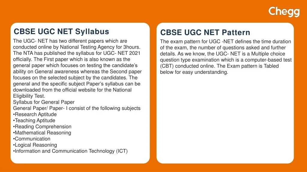 CBSE UGC NET Syllabus The UGC- NET has two different papers which are conducted online by National Testing Agency for 3hours. The NTA has published the syllabus for UGC- NET 2021 officially. The First paper which is also known as the general paper which focuses on testing the candidate’s ability on General awareness whereas the Second paper focuses on the selected subject by the candidates. The general and the specific subject Paper’s syllabus can be downloaded from the official website for the National Eligibility Test. Syllabus for General Paper General Paper/ Paper- I consist of the following subjects •Research Aptitude •Teaching Aptitude •Reading Comprehension •Mathematical Reasoning •Communication •Logical Reasoning •Information and Communication Technology (ICT) CBSE UGC NET Pattern The exam pattern for UGC -NET defines the time duration of the exam, the number of questions asked and further details. As we know, the UGC- NET is a Multiple choice question type examination which is a computer-based test (CBT) conducted online. The Exam pattern is Tabled below for easy understanding.