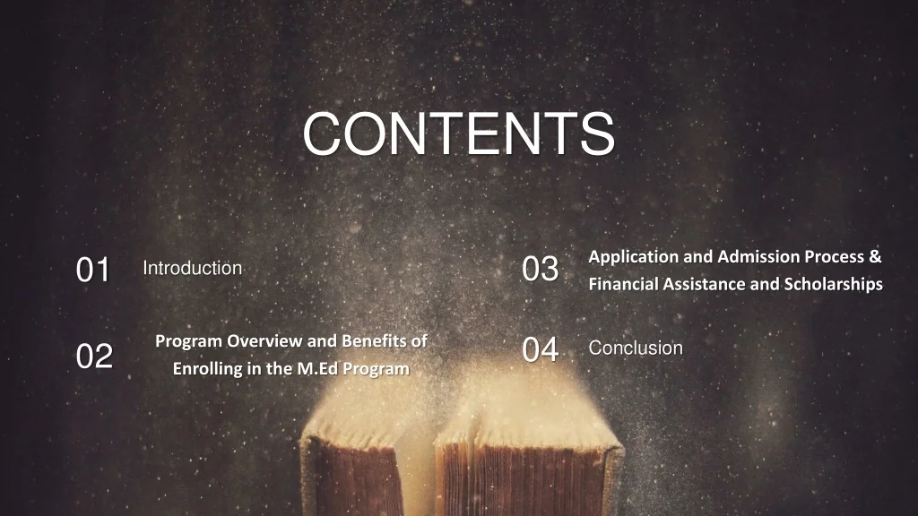 CONTENTS 01 Introduction 02 Program Overview and Benefits of Enrolling in the M.Ed Program 03 Application and Admission Process & Financial Assistance and Scholarships 04 Conclusion