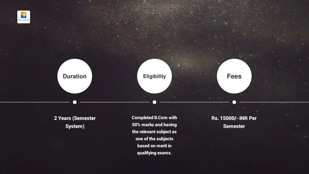 Duration Eligibility Fees 2 Years (Semester System) Completed B.Com with 50% marks and having the relevant subject as one of the subjects based on merit in qualifying exams. Rs. 15000/- INR Per Semester
