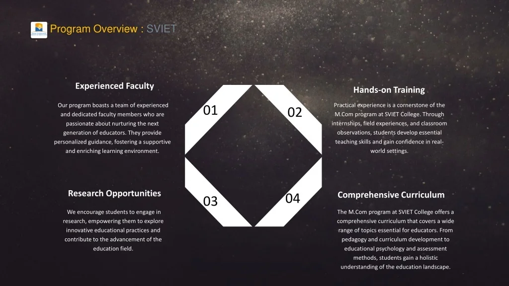 Program Overview : SVIET Experienced Faculty Hands-on Training Practical experience is a cornerstone of the M.Com program at SVIET College. Through internships, field experiences, and classroom observations, students develop essential teaching skills and gain confidence in real-world settings. 01 Our program boasts a team of experienced and dedicated faculty members who are passionate about nurturing the next generation of educators. They provide personalized guidance, fostering a supportive and enriching learning environment. 02 Research Opportunities 04 Comprehensive Curriculum 03 We encourage students to engage in research, empowering them to explore innovative educational practices and contribute to the advancement of the education field. The M.Com program at SVIET College offers a comprehensive curriculum that covers a wide range of topics essential for educators. From pedagogy and curriculum development to educational psychology and assessment methods, students gain a holistic understanding of the education landscape.
