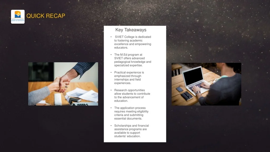 QUICK RECAP Key Takeaways • SVIET College is dedicated to fostering academic excellence and empowering educators. • The M.Ed program at SVIET offers advanced pedagogical knowledge and specialized expertise. • Practical experience is emphasized through internships and field experiences. • Research opportunities allow students to contribute to the advancement of education. • The application process requires meeting eligibility criteria and submitting essential documents. • Scholarships and financial assistance programs are available to support students' education.