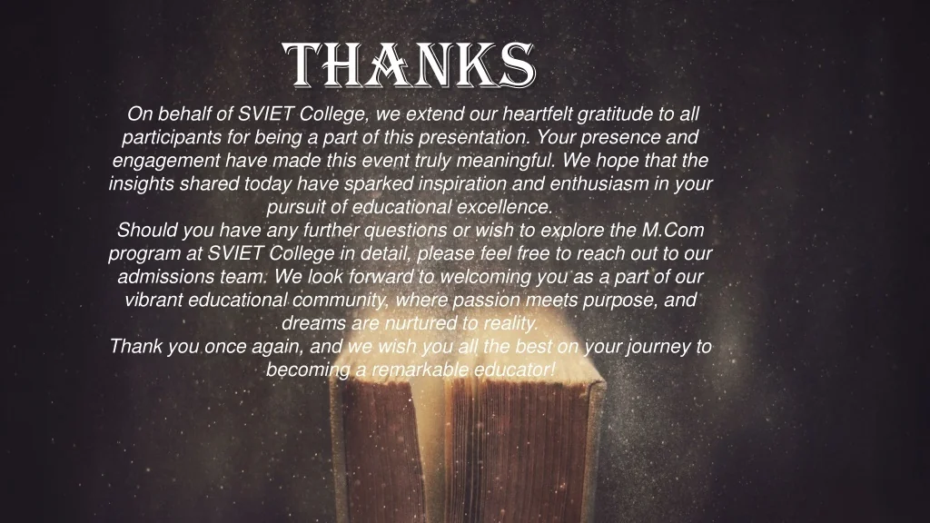 THANKS On behalf of SVIET College, we extend our heartfelt gratitude to all participants for being a part of this presentation. Your presence and engagement have made this event truly meaningful. We hope that the insights shared today have sparked inspiration and enthusiasm in your pursuit of educational excellence. Should you have any further questions or wish to explore the M.Com program at SVIET College in detail, please feel free to reach out to our admissions team. We look forward to welcoming you as a part of our vibrant educational community, where passion meets purpose, and dreams are nurtured to reality. Thank you once again, and we wish you all the best on your journey to becoming a remarkable educator! .