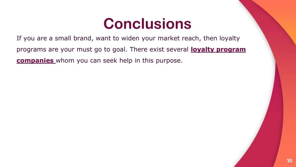 Conclusions If you are a small brand, want to widen your market reach, then loyalty programs are your must go to goal. There exist several loyalty program companies whom you can seek help in this purpose.