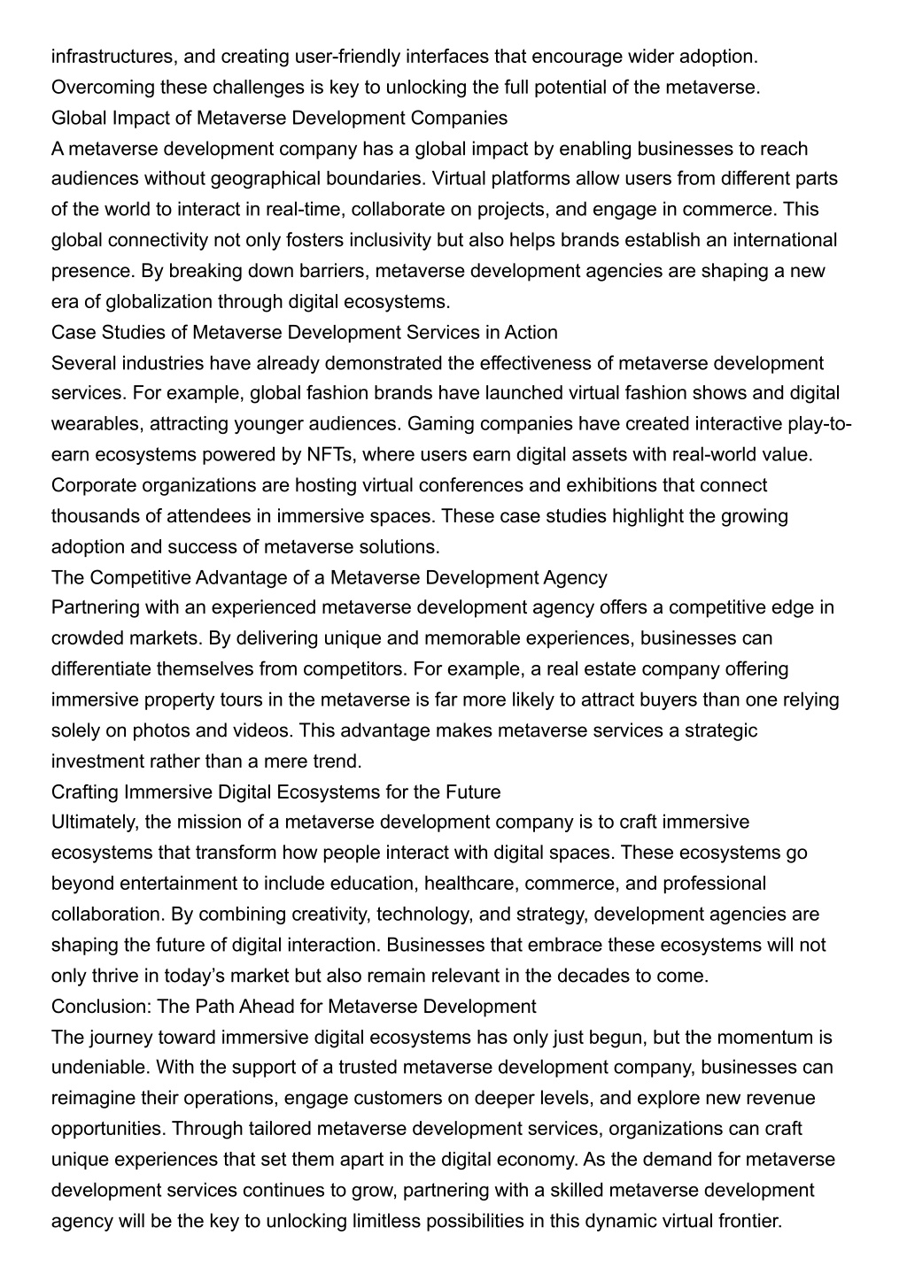 infrastructures, and creating user-friendly interfaces that encourage wider adoption. Overcoming these challenges is key to unlocking the full potential of the metaverse. Global Impact of Metaverse Development Companies A metaverse development company has a global impact by enabling businesses to reach audiences without geographical boundaries. Virtual platforms allow users from different parts of the world to interact in real-time, collaborate on projects, and engage in commerce. This global connectivity not only fosters inclusivity but also helps brands establish an international presence. By breaking down barriers, metaverse development agencies are shaping a new era of globalization through digital ecosystems. Case Studies of Metaverse Development Services in Action Several industries have already demonstrated the effectiveness of metaverse development services. For example, global fashion brands have launched virtual fashion shows and digital wearables, attracting younger audiences. Gaming companies have created interactive play-to- earn ecosystems powered by NFTs, where users earn digital assets with real-world value. Corporate organizations are hosting virtual conferences and exhibitions that connect thousands of attendees in immersive spaces. These case studies highlight the growing adoption and success of metaverse solutions. The Competitive Advantage of a Metaverse Development Agency Partnering with an experienced metaverse development agency offers a competitive edge in crowded markets. By delivering unique and memorable experiences, businesses can differentiate themselves from competitors. For example, a real estate company offering immersive property tours in the metaverse is far more likely to attract buyers than one relying solely on photos and videos. This advantage makes metaverse services a strategic investment rather than a mere trend. Crafting Immersive Digital Ecosystems for the Future Ultimately, the mission of a metaverse development company is to craft immersive ecosystems that transform how people interact with digital spaces. These ecosystems go beyond entertainment to include education, healthcare, commerce, and professional collaboration. By combining creativity, technology, and strategy, development agencies are shaping the future of digital interaction. Businesses that embrace these ecosystems will not only thrive in today’s market but also remain relevant in the decades to come. Conclusion: The Path Ahead for Metaverse Development The journey toward immersive digital ecosystems has only just begun, but the momentum is undeniable. With the support of a trusted metaverse development company, businesses can reimagine their operations, engage customers on deeper levels, and explore new revenue opportunities. Through tailored metaverse development services, organizations can craft unique experiences that set them apart in the digital economy. As the demand for metaverse development services continues to grow, partnering with a skilled metaverse development agency will be the key to unlocking limitless possibilities in this dynamic virtual frontier.