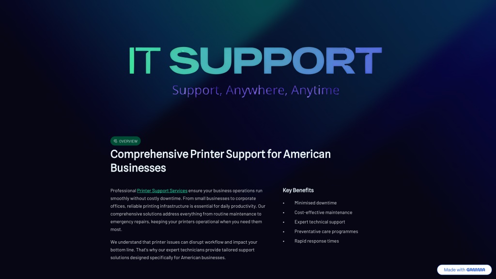 2. OVERVIEW Comprehensive Printer Support for American Businesses Professional Printer Support Services ensure your business operations run smoothly without costly downtime. From small businesses to corporate offices, reliable printing infrastructure is essential for daily productivity. Our comprehensive solutions address everything from routine maintenance to emergency repairs, keeping your printers operational when you need them most. Key Benefits • Minimised downtime • Cost-effective maintenance • Expert technical support • Preventative care programmes • Rapid response times We understand that printer issues can disrupt workflow and impact your bottom line. That's why our expert technicians provide tailored support solutions designed specifically for American businesses.