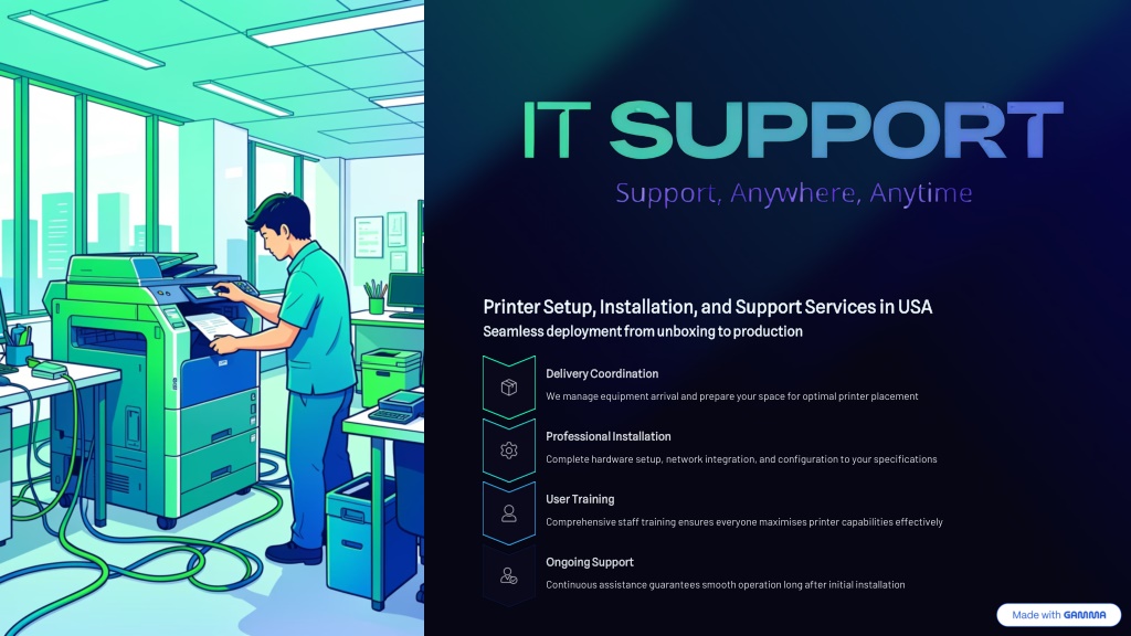 8. Printer Setup, Installation, and Support Services in USA Seamless deployment from unboxing to production Delivery Coordination We manage equipment arrival and prepare your space for optimal printer placement Professional Installation Complete hardware setup, network integration, and configuration to your specifications User Training Comprehensive staff training ensures everyone maximises printer capabilities effectively Ongoing Support Continuous assistance guarantees smooth operation long after initial installation