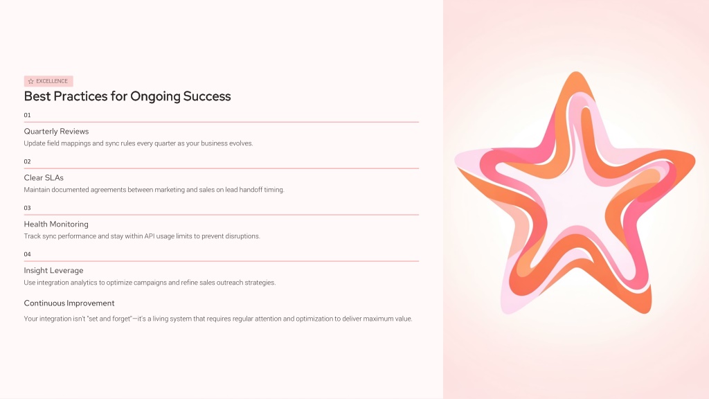 EXCELLENCE Best Practices for Ongoing Success 01 Quarterly Reviews Update field mappings and sync rules every quarter as your business evolves. 02 Clear SLAs Maintain documented agreements between marketing and sales on lead handoff timing. 03 Health Monitoring Track sync performance and stay within API usage limits to prevent disruptions. 04 Insight Leverage Use integration analytics to optimize campaigns and refine sales outreach strategies. Continuous Improvement Your integration isn't "set and forget"—it's a living system that requires regular attention and optimization to deliver maximum value.