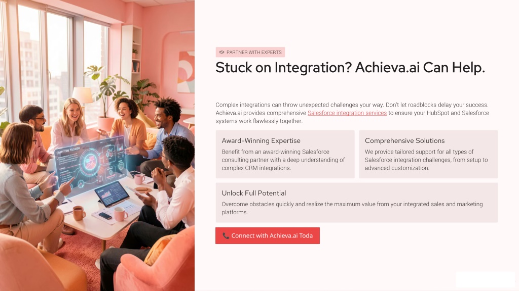 PARTNER WITH EXPERTS Stuck on Integration? Achieva.ai Can Help. Complex integrations can throw unexpected challenges your way. Don't let roadblocks delay your success. Achieva.ai provides comprehensive Salesforce integration services to ensure your HubSpot and Salesforce systems work flawlessly together. Award-Winning Expertise Comprehensive Solutions Benefit from an award-winning Salesforce consulting partner with a deep understanding of complex CRM integrations. We provide tailored support for all types of Salesforce integration challenges, from setup to advanced customization. Unlock Full Potential Overcome obstacles quickly and realize the maximum value from your integrated sales and marketing platforms.