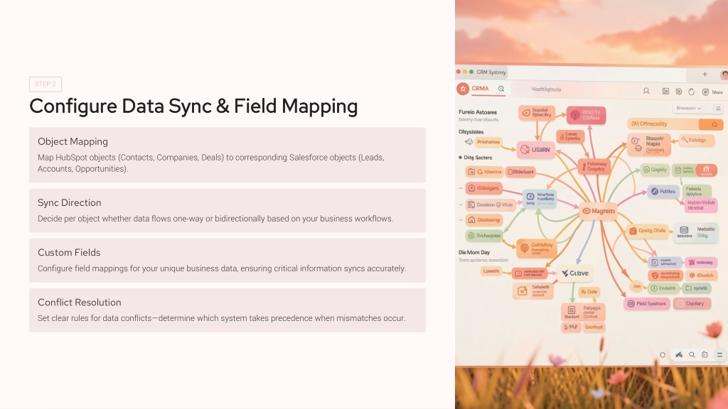 STEP 2 Configure Data Sync & Field Mapping Object Mapping Map HubSpot objects (Contacts, Companies, Deals) to corresponding Salesforce objects (Leads, Accounts, Opportunities). Sync Direction Decide per object whether data flows one-way or bidirectionally based on your business workflows. Custom Fields Configure field mappings for your unique business data, ensuring critical information syncs accurately. Conflict Resolution Set clear rules for data conflicts—determine which system takes precedence when mismatches occur.