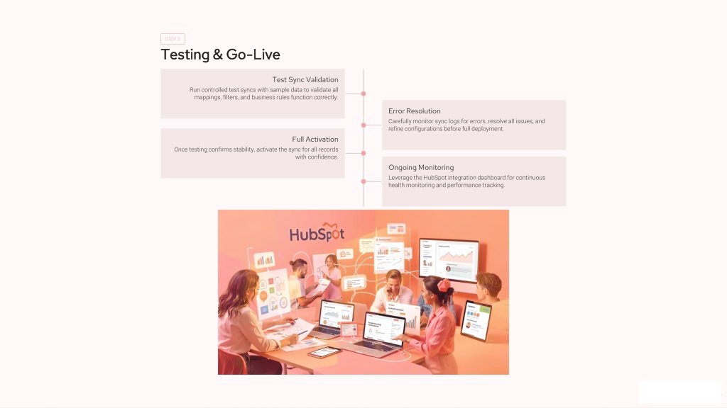 STEP 3 Testing & Go-Live Test Sync Validation Run controlled test syncs with sample data to validate all mappings, filters, and business rules function correctly. Error Resolution Carefully monitor sync logs for errors, resolve all issues, and refine configurations before full deployment. Full Activation Once testing confirms stability, activate the sync for all records with confidence. Ongoing Monitoring Leverage the HubSpot integration dashboard for continuous health monitoring and performance tracking.