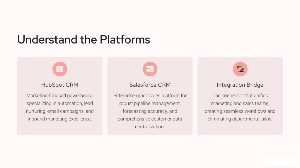 Understand the Platforms HubSpot CRM Salesforce CRM Integration Bridge Marketing-focused powerhouse specializing in automation, lead nurturing, email campaigns, and inbound marketing excellence. Enterprise-grade sales platform for robust pipeline management, forecasting accuracy, and comprehensive customer data centralization. The connector that unifies marketing and sales teams, creating seamless workflows and eliminating departmental silos.