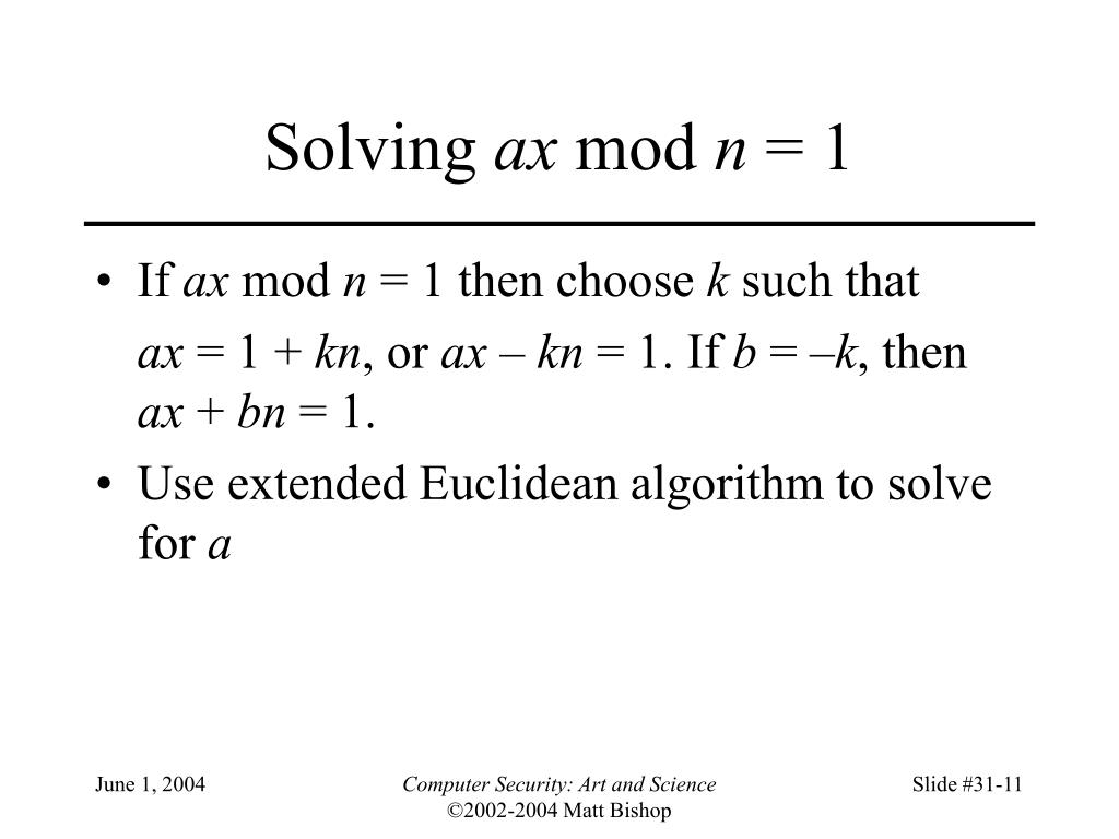 Solving ax mod n = b • A fundamental law of modular arithmetic: xy mod n = (x mod n)(y mod n) mod n so if x solves ax mod n = 1, then as b(ax mod n) = a(bx) mod n = b bx solves ax mod n = b Computer Security: Art and Science ©2002-2004 Matt Bishop
