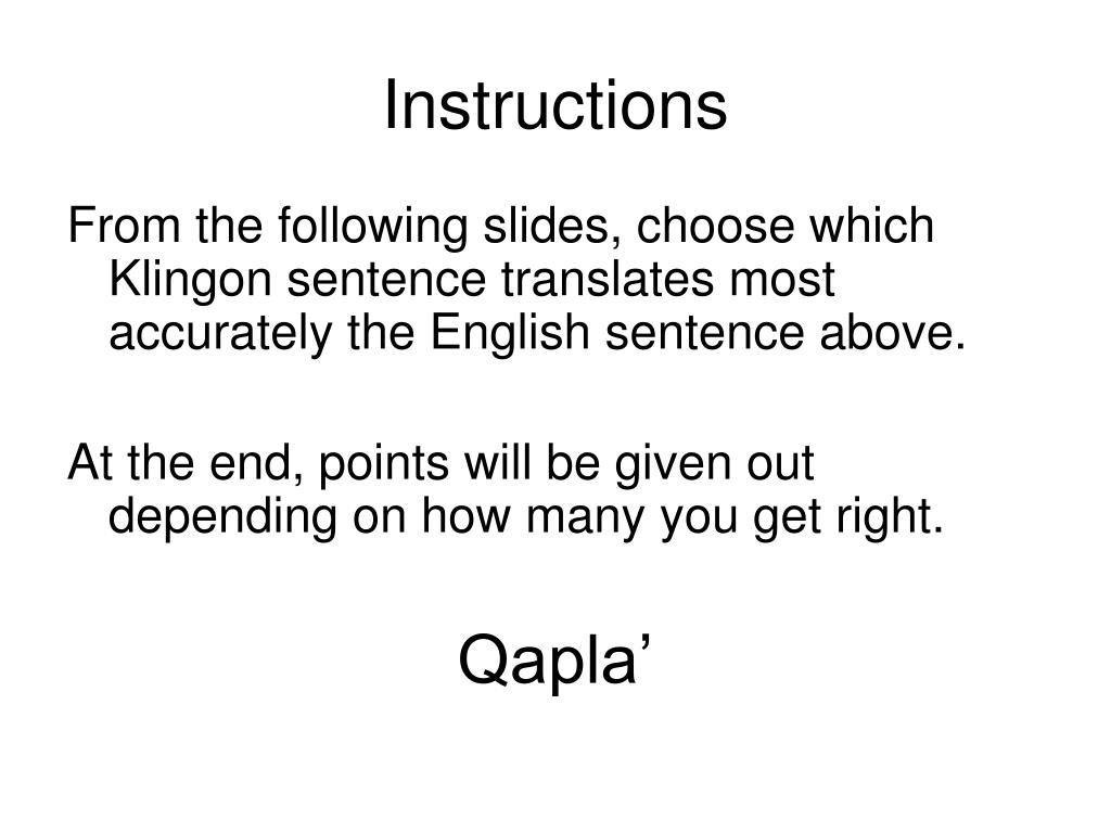 The Klingon Language MEGA-CHALLENGE. Instructions. From the following slides, choose which Klingon sentence translates most accurately the English sentence above. At the end, points will be given out depending on how many you get right. Qapla’. His armies are assembling on that planet.