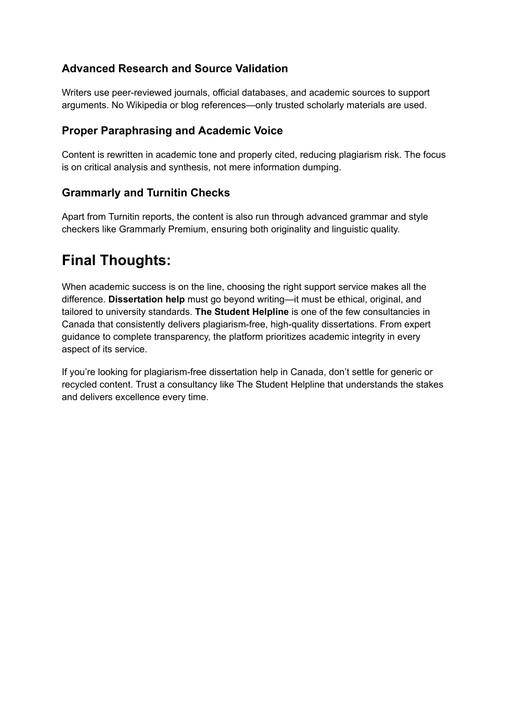 The Student Helpline: Your Trusted Source for Plagiarism-Free Dissertation Help in Canada When it comes to professional, plagiarism-free dissertation writing in Canada, The Student Helpline stands out for its reliability, quality, and strict adherence to academic integrity. Why Choose The Student Helpline? 1. 100% Original Dissertations Every dissertation is custom-written after detailed consultation with the student. The content is built from scratch, ensuring full originality and zero duplication. 2. Detailed Plagiarism Report Provided To maintain transparency, The Student Helpline provides a Turnitin report with every dissertation order. This allows students to confidently submit their work to universities. 3. Highly Qualified Academic Experts The consultancy employs experienced PhD scholars and researchers who understand the nuances of academic writing. Their expertise ensures that every dissertation aligns with the academic expectations of Canadian universities. 4. University-Specific Formatting and Referencing