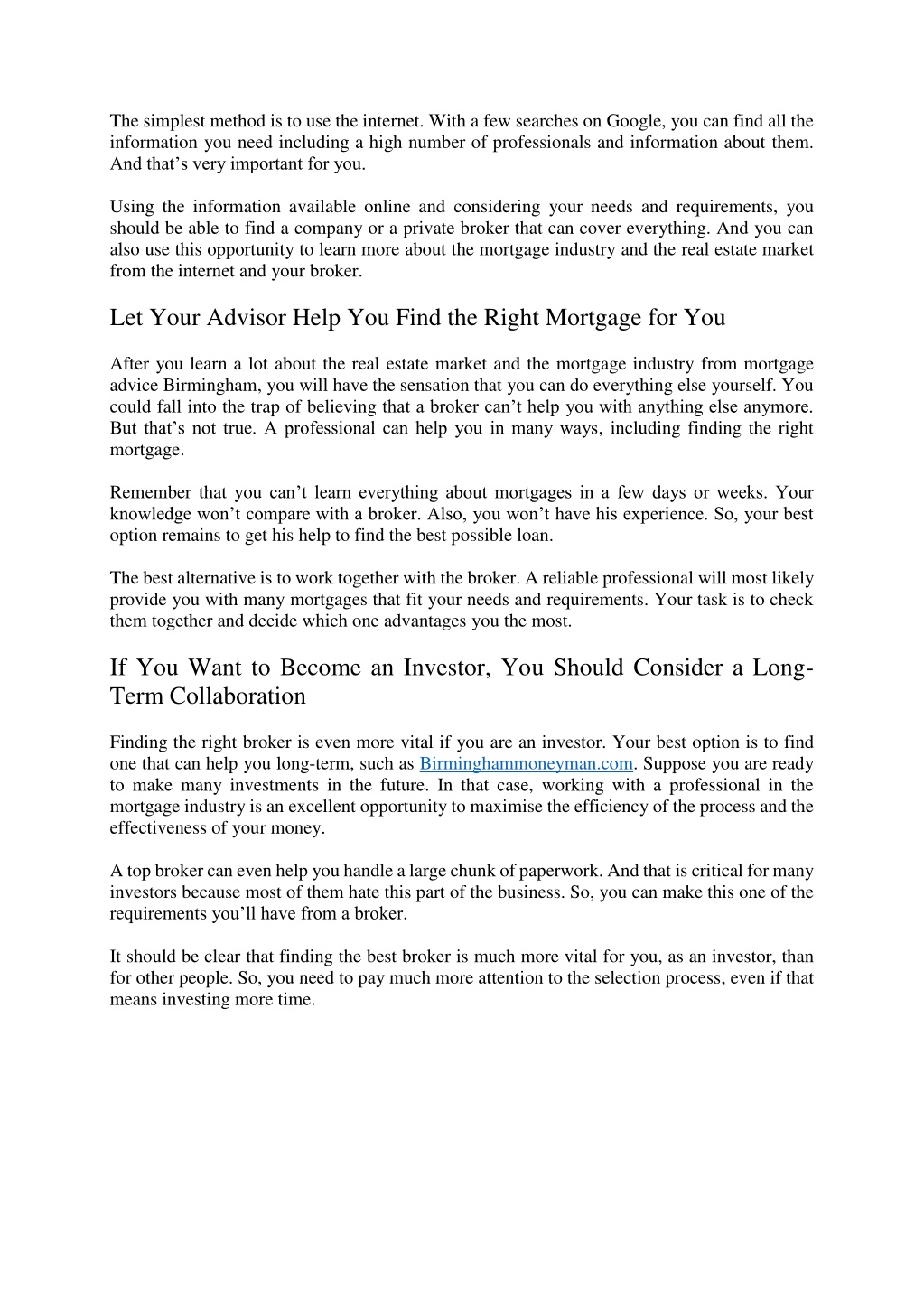 The simplest method is to use the internet. With a few searches on Google, you can find all the information you need including a high number of professionals and information about them. And that’s very important for you. Using the information available online and considering your needs and requirements, you should be able to find a company or a private broker that can cover everything. And you can also use this opportunity to learn more about the mortgage industry and the real estate market from the internet and your broker. Let Your Advisor Help You Find the Right Mortgage for You After you learn a lot about the real estate market and the mortgage industry from mortgage advice Birmingham, you will have the sensation that you can do everything else yourself. You could fall into the trap of believing that a broker can’t help you with anything else anymore. But that’s not true. A professional can help you in many ways, including finding the right mortgage. Remember that you can’t learn everything about mortgages in a few days or weeks. Your knowledge won’t compare with a broker. Also, you won’t have his experience. So, your best option remains to get his help to find the best possible loan. The best alternative is to work together with the broker. A reliable professional will most likely provide you with many mortgages that fit your needs and requirements. Your task is to check them together and decide which one advantages you the most. If You Want to Become an Investor, You Should Consider a Long- Term Collaboration Finding the right broker is even more vital if you are an investor. Your best option is to find one that can help you long-term, such as Birminghammoneyman.com. Suppose you are ready to make many investments in the future. In that case, working with a professional in the mortgage industry is an excellent opportunity to maximise the efficiency of the process and the effectiveness of your money. A top broker can even help you handle a large chunk of paperwork. And that is critical for many investors because most of them hate this part of the business. So, you can make this one of the requirements you’ll have from a broker. It should be clear that finding the best broker is much more vital for you, as an investor, than for other people. So, you need to pay much more attention to the selection process, even if that means investing more time.