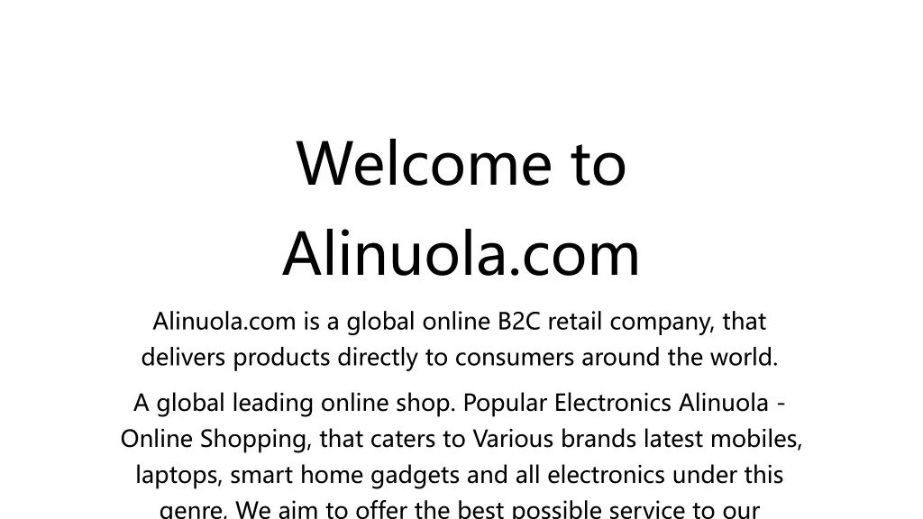 Welcome to Alinuola.com Alinuola.com is a global online B2C retail company, that delivers products directly to consumers around the world. A global leading online shop. Popular Electronics Alinuola - Online Shopping, that caters to Various brands latest mobiles, laptops, smart home gadgets and all electronics under this genre, We aim to offer the best possible service to our Global customers, ensuring that we have the High efficiency shipping and the lowest prices, Worldwide Free Shipping We're starting to provide "Online Services" as well. Talk to us