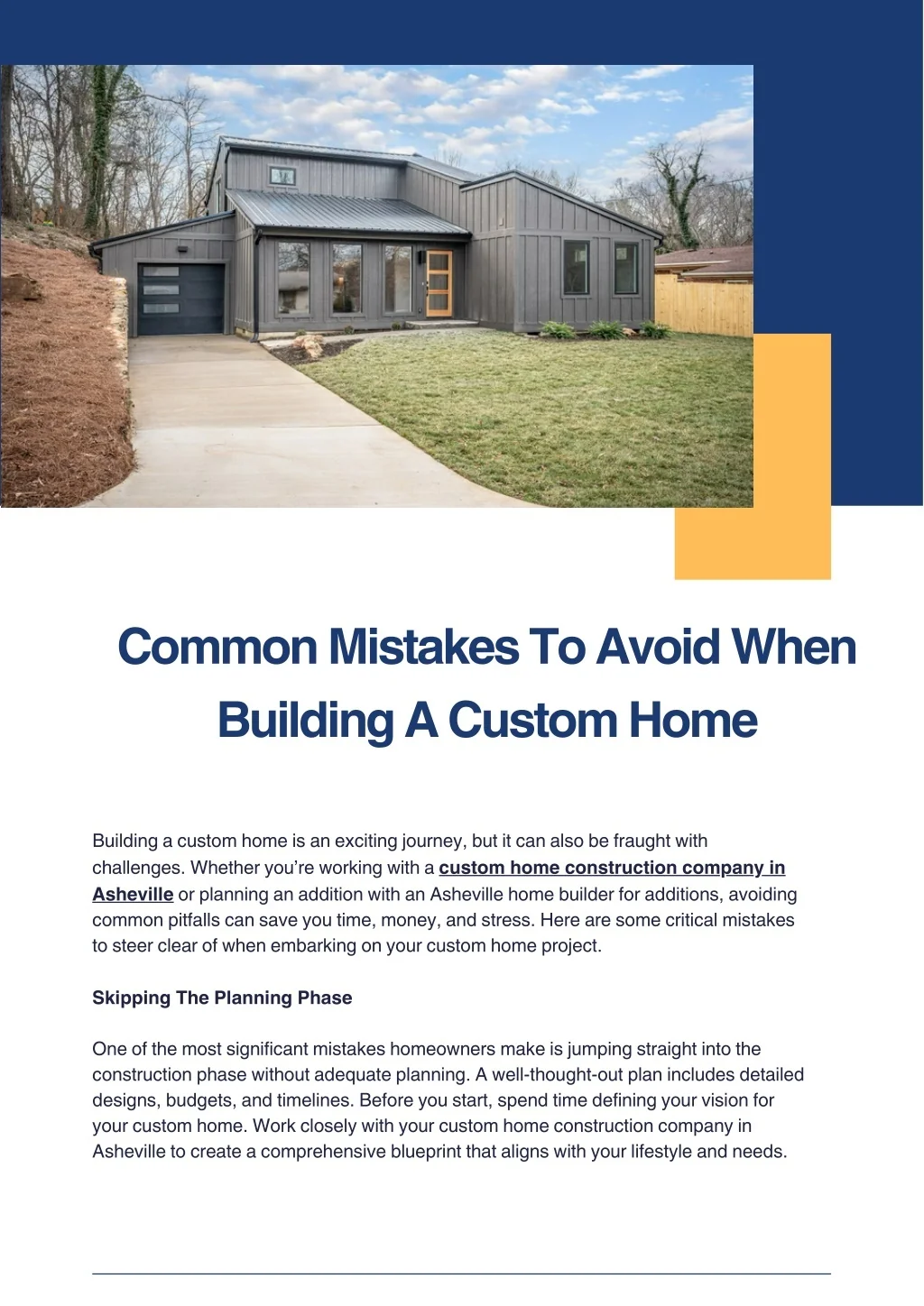 Common Mistakes To Avoid When Building A Custom Home Building a custom home is an exciting journey, but it can also be fraught with challenges. Whether you’re working with a custom home construction company in Asheville or planning an addition with an Asheville home builder for additions, avoiding common pitfalls can save you time, money, and stress. Here are some critical mistakes to steer clear of when embarking on your custom home project. Skipping The Planning Phase One of the most significant mistakes homeowners make is jumping straight into the construction phase without adequate planning. A well-thought-out plan includes detailed designs, budgets, and timelines. Before you start, spend time defining your vision for your custom home. Work closely with your custom home construction company in Asheville to create a comprehensive blueprint that aligns with your lifestyle and needs.