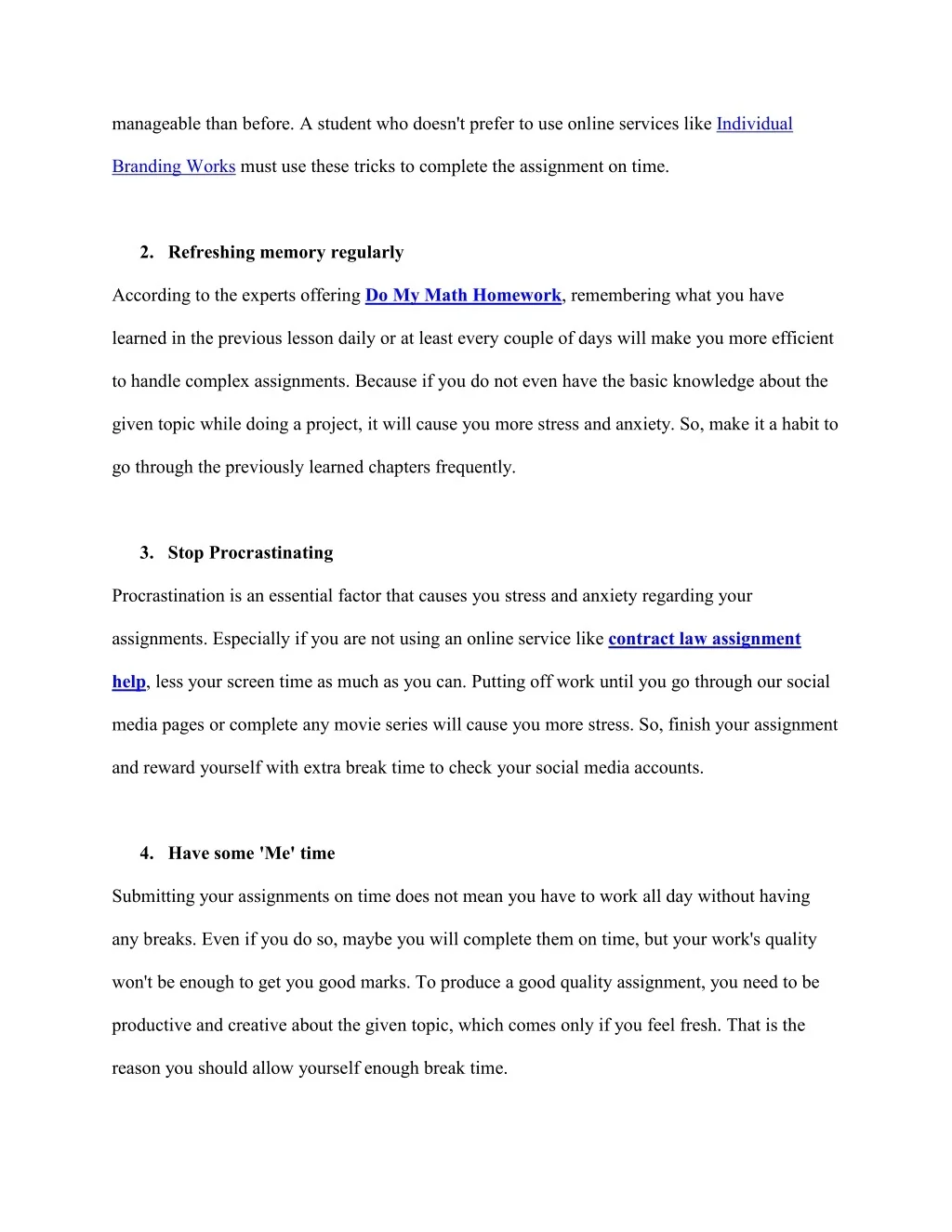 manageable than before. A student who doesn't prefer to use online services like Individual Branding Works must use these tricks to complete the assignment on time. 2. Refreshing memory regularly According to the experts offering Do My Math Homework, remembering what you have learned in the previous lesson daily or at least every couple of days will make you more efficient to handle complex assignments. Because if you do not even have the basic knowledge about the given topic while doing a project, it will cause you more stress and anxiety. So, make it a habit to go through the previously learned chapters frequently. 3. Stop Procrastinating Procrastination is an essential factor that causes you stress and anxiety regarding your assignments. Especially if you are not using an online service like contract law assignment help, less your screen time as much as you can. Putting off work until you go through our social media pages or complete any movie series will cause you more stress. So, finish your assignment and reward yourself with extra break time to check your social media accounts. 4. Have some 'Me' time Submitting your assignments on time does not mean you have to work all day without having any breaks. Even if you do so, maybe you will complete them on time, but your work's quality won't be enough to get you good marks. To produce a good quality assignment, you need to be productive and creative about the given topic, which comes only if you feel fresh. That is the reason you should allow yourself enough break time.