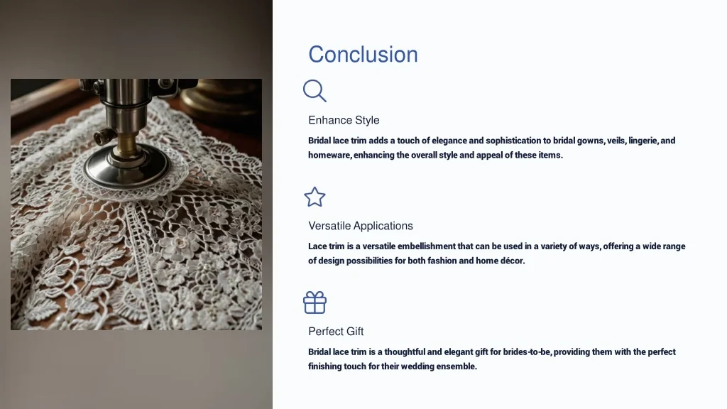 Conclusion Enhance Style Bridal lace trim adds a touch of elegance and sophistication to bridal gowns, veils, lingerie, and homeware, enhancing the overall style and appeal of these items. Versatile Applications Lace trim is a versatile embellishment that can be used in a variety of ways, offering a wide range of design possibilities for both fashion and home décor. Perfect Gift Bridal lace trim is a thoughtful and elegant gift for brides-to-be, providing them with the perfect finishing touch for their wedding ensemble.
