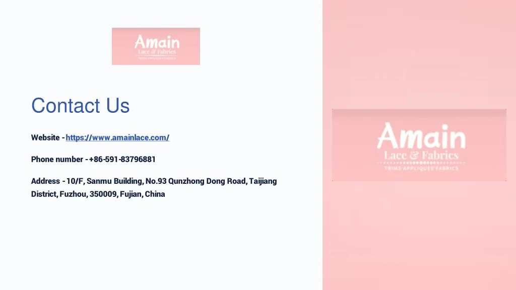 Contact Us Website - https://www.amainlace.com/ Phone number - +86-591-83796881 Address - 10/F, Sanmu Building, No.93 Qunzhong Dong Road, Taijiang District, Fuzhou, 350009, Fujian, China
