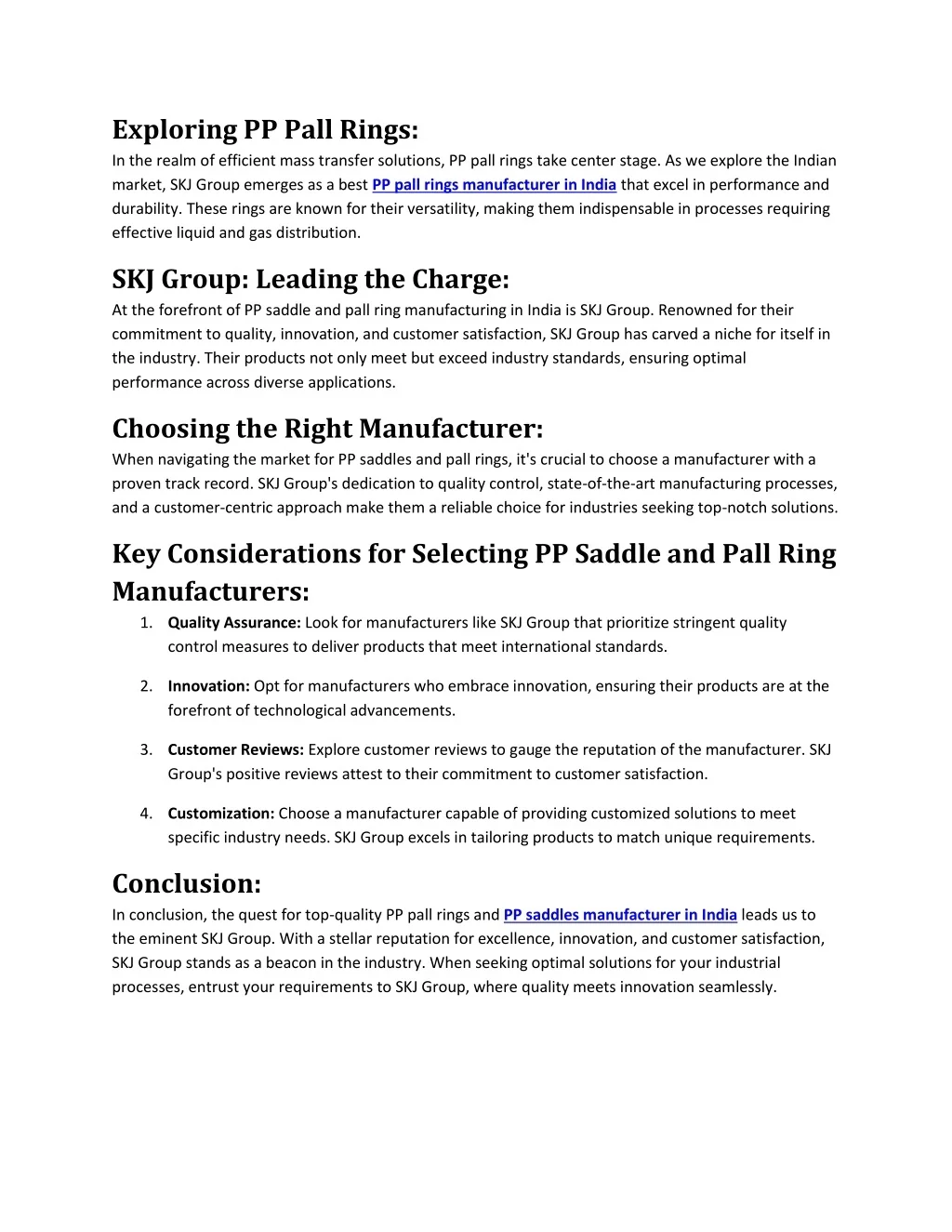 Unveiling Exceptional PP Saddle and Pall Ring Manufacturers in India: Navigating the World of Optimal Solutions When it comes to superior quality PP saddles and pall rings, India stands tall with a host of reliable manufacturers. In this guide, we delve into the realm of optimal solutions, shedding light on the top players in the market, with SKJ Group leading the way. Understanding PP Saddles: Polypropylene (PP) saddles play a crucial role in various industrial applications, offering excellent heat and chemical resistance. SKJ Group, a prominent name in the industry, sets the benchmark for quality PP saddles in India. Their commitment to innovation and reliability has made them a preferred choice among discerning customers.