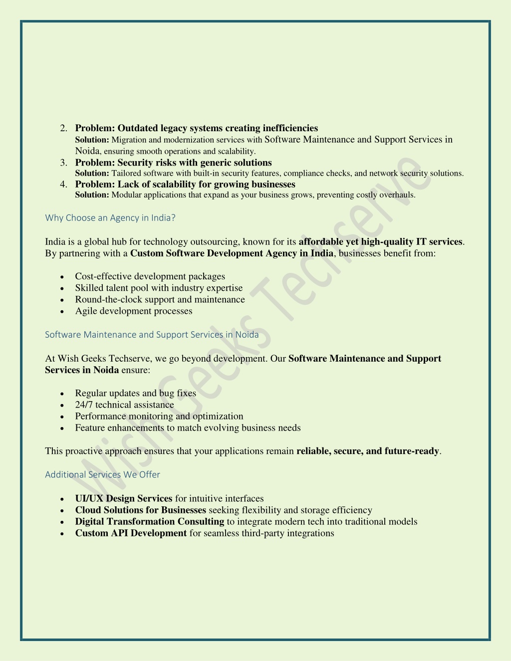2.Problem: Outdated legacy systems creating inefficiencies Solution: Migration and modernization services with Software Maintenance and Support Services in Noida, ensuring smooth operations and scalability. 3.Problem: Security risks with generic solutions Solution: Tailored software with built-in security features, compliance checks, and network security solutions. 4.Problem: Lack of scalability for growing businesses Solution: Modular applications that expand as your business grows, preventing costly overhauls. Why Choose an Agency in India? India is a global hub for technology outsourcing, known for its affordable yet high-quality IT services. By partnering with a Custom Software Development Agency in India, businesses benefit from: Cost-effective development packages Skilled talent pool with industry expertise Round-the-clock support and maintenance Agile development processes Software Maintenance and Support Services in Noida At Wish Geeks Techserve, we go beyond development. Our Software Maintenance and Support Services in Noida ensure: Regular updates and bug fixes 24/7 technical assistance Performance monitoring and optimization Feature enhancements to match evolving business needs This proactive approach ensures that your applications remain reliable, secure, and future-ready. Additional Services We Offer UI/UX Design Services for intuitive interfaces Cloud Solutions for Businesses seeking flexibility and storage efficiency Digital Transformation Consulting to integrate modern tech into traditional models Custom API Development for seamless third-party integrations