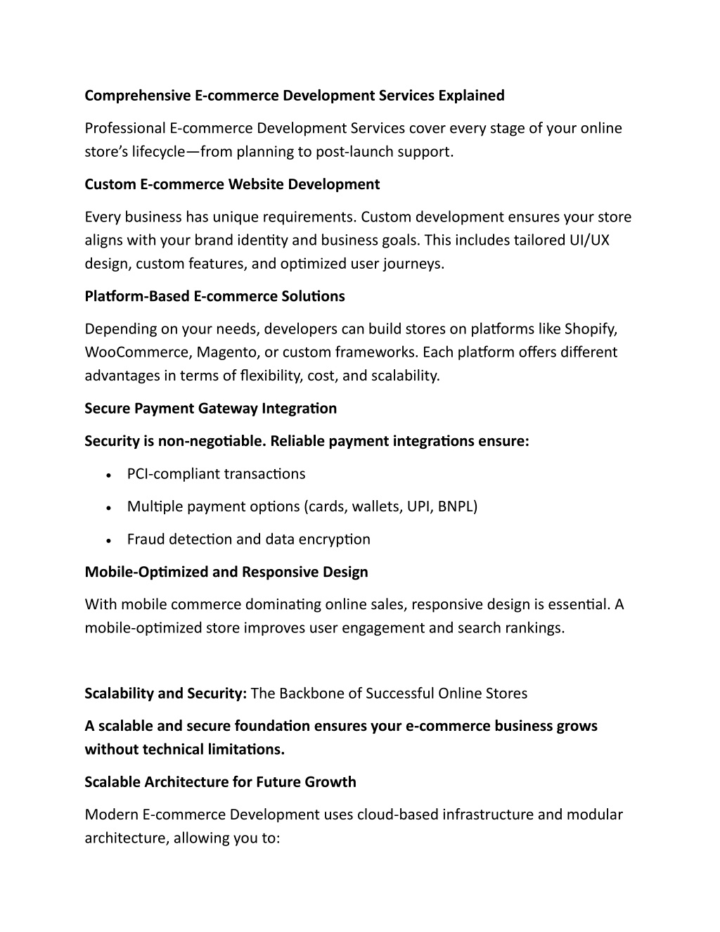 2. Comprehensive E-commerce Development Services Explained Professional E-commerce Development Services cover every stage of your online store’s lifecycle—from planning to post-launch support. Custom E-commerce Website Development Every business has unique requirements. Custom development ensures your store aligns with your brand identity and business goals. This includes tailored UI/UX design, custom features, and optimized user journeys. Platform-Based E-commerce Solutions Depending on your needs, developers can build stores on platforms like Shopify, WooCommerce, Magento, or custom frameworks. Each platform offers different advantages in terms of flexibility, cost, and scalability. Secure Payment Gateway Integration Security is non-negotiable. Reliable payment integrations ensure: •PCI-compliant transactions •Multiple payment options (cards, wallets, UPI, BNPL) •Fraud detection and data encryption Mobile-Optimized and Responsive Design With mobile commerce dominating online sales, responsive design is essential. A mobile-optimized store improves user engagement and search rankings. Scalability and Security: The Backbone of Successful Online Stores A scalable and secure foundation ensures your e-commerce business grows without technical limitations. Scalable Architecture for Future Growth Modern E-commerce Development uses cloud-based infrastructure and modular architecture, allowing you to: