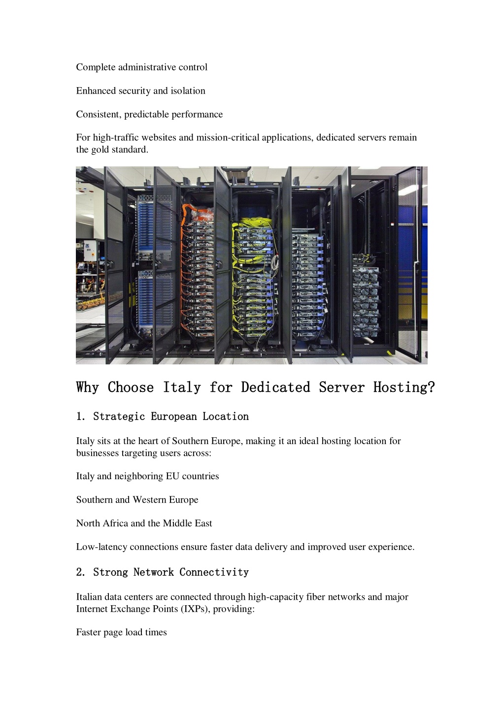 Complete administrative control Enhanced security and isolation Consistent, predictable performance For high-traffic websites and mission-critical applications, dedicated servers remain the gold standard. Why Choose Italy for Dedicated Server Hosting? Why Choose Italy for Dedicated Server Hosting? 1. Strategic European Location 1. Strategic European Location Italy sits at the heart of Southern Europe, making it an ideal hosting location for businesses targeting users across: Italy and neighboring EU countries Southern and Western Europe North Africa and the Middle East Low-latency connections ensure faster data delivery and improved user experience. 2. Strong Network C 2. Strong Network Connectivity onnectivity Italian data centers are connected through high-capacity fiber networks and major Internet Exchange Points (IXPs), providing: Faster page load times