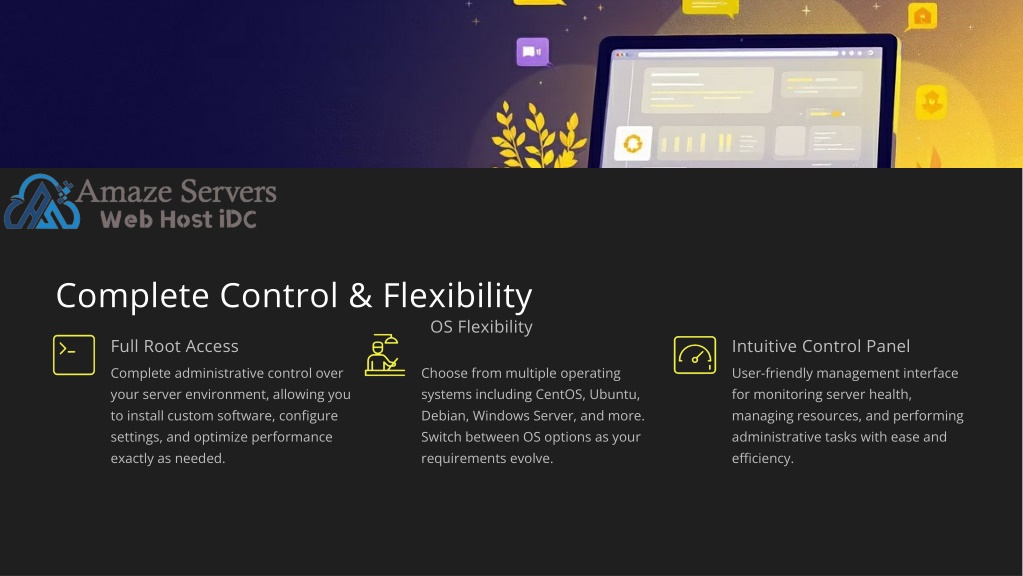 Complete Control & Flexibility OSFlexibility FullRootAccess Complete administrative control over your server environment, allowing you to install custom software, configure settings, and optimize performance exactly as needed. Intuitive Control Panel User-friendly management interface for monitoring server health, managing resources, and performing administrative tasks with ease and efficiency. Choose from multiple operating systems including CentOS, Ubuntu, Debian, Windows Server, and more. Switch between OS options as your requirements evolve.
