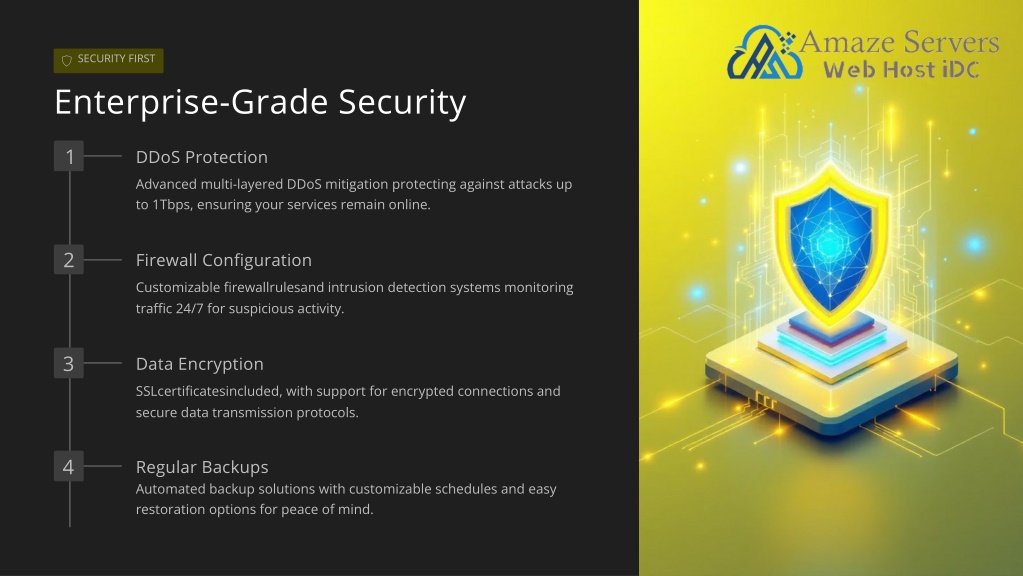 SECURITY FIRST Enterprise-Grade Security 1 DDoSProtection Advanced multi-layered DDoS mitigation protecting against attacks up to 1Tbps, ensuring your services remain online. 2 Firewall Configuration Customizable firewallrulesand intrusion detection systems monitoring traffic 24/7 for suspicious activity. 3 Data Encryption SSLcertificatesincluded, with support for encrypted connections and secure data transmission protocols. 4 Regular Backups Automated backup solutions with customizable schedules and easy restoration options for peace of mind.