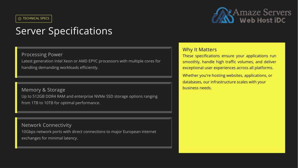 TECHNICAL SPECS Server Specifications Why It Matters These specifications ensure your applications run smoothly, handle high traffic volumes, and deliver exceptional user experiences across all platforms. Processing Power Latest generation Intel Xeon or AMD EPYC processors with multiple cores for handling demanding workloads efficiently. Whether you're hosting websites, applications, or databases, our infrastructure scales with your business needs. Memory & Storage Up to 512GB DDR4 RAM and enterprise NVMe SSD storage options ranging from 1TB to 10TB for optimal performance. Network Connectivity 10Gbps network ports with direct connections to major European internet exchanges for minimal latency.