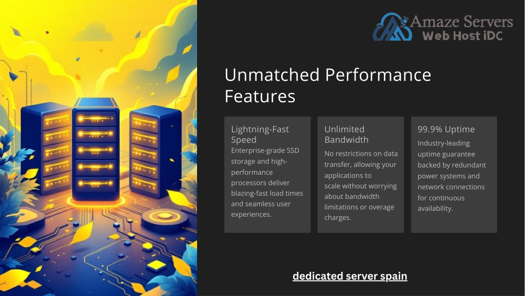 Unmatched Performance Features Lightning-Fast Speed Enterprise-grade SSD storage and high- performance processors deliver blazing-fast load times and seamless user experiences. Unlimited Bandwidth No restrictions on data transfer, allowing your applications to scale without worrying about bandwidth limitations or overage charges. 99.9% Uptime Industry-leading uptime guarantee backed by redundant power systems and network connections for continuous availability. dedicated server spain