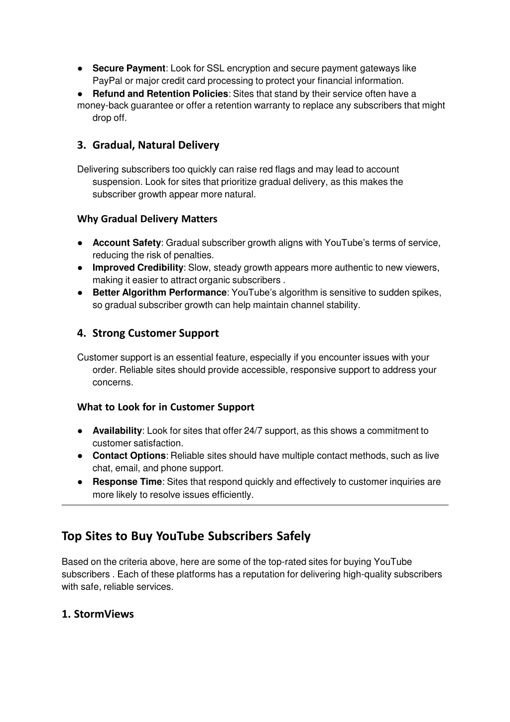 SecurePayment:LookforSSLencryptionandsecurepaymentgatewayslikePayPalormajorcreditcardprocessingtoprotectyourfinancialinformation.SecurePayment:LookforSSLencryptionandsecurepaymentgatewayslikePayPalormajorcreditcardprocessingtoprotectyourfinancialinformation. • RefundandRetentionPolicies:Sitesthatstandbytheirserviceoftenhavea • money-backguaranteeorofferaretentionwarrantytoreplaceanysubscribersthatmightdropoff. • Gradual,NaturalDelivery • Deliveringsubscriberstooquicklycanraiseredflagsandmayleadtoaccountsuspension.Lookforsitesthatprioritizegradualdelivery,asthismakesthesubscribergrowthappearmorenatural. • WhyGradualDeliveryMatters • AccountSafety:GradualsubscribergrowthalignswithYouTube’stermsofservice,reducingtheriskofpenalties. • ImprovedCredibility:Slow,steadygrowthappearsmoreauthentictonewviewers,makingiteasiertoattractorganicsubscribers. • BetterAlgorithmPerformance:YouTube’salgorithmissensitivetosuddenspikes,sogradualsubscribergrowthcanhelpmaintainchannelstability. • StrongCustomerSupport • Customersupportisanessentialfeature,especiallyifyouencounterissueswithyourorder.Reliablesitesshouldprovideaccessible,responsivesupporttoaddressyourconcerns. • WhattoLookforinCustomerSupport • Availability:Lookforsitesthatoffer24/7support,asthisshowsacommitmenttocustomersatisfaction. • ContactOptions:Reliablesitesshouldhavemultiplecontactmethods,suchaslivechat,email,andphonesupport. • ResponseTime:Sitesthatrespondquicklyandeffectivelytocustomerinquiriesaremorelikelytoresolveissuesefficiently. TopSitestoBuyYouTubeSubscribersSafely Basedonthecriteriaabove,herearesomeofthetop-ratedsitesforbuyingYouTubesubscribers.Eachoftheseplatformshasareputationfordeliveringhigh-qualitysubscriberswithsafe,reliableservices. 1.StormViews