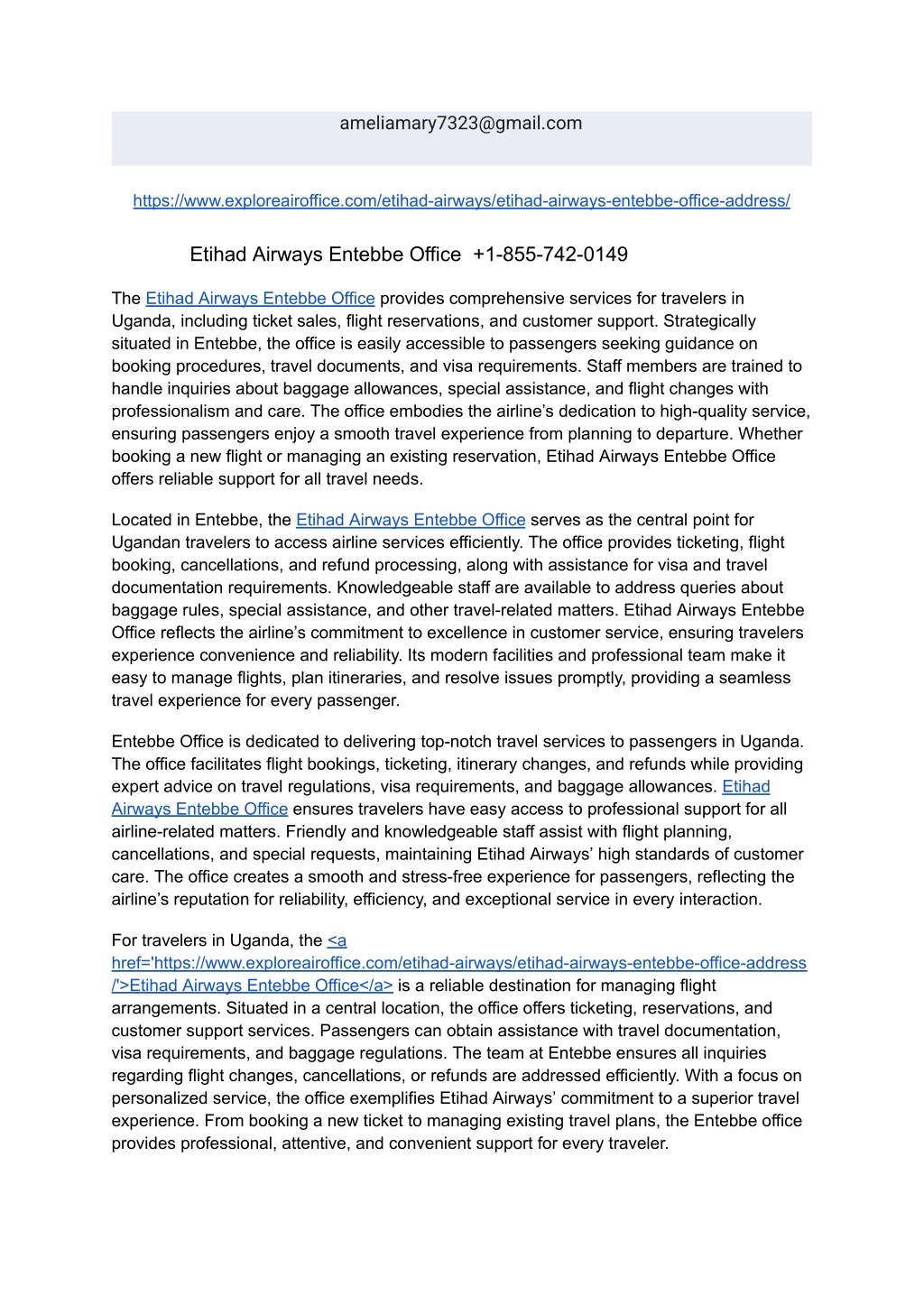 ameliamary7323@gmail.com https://www.exploreairoffice.com/etihad-airways/etihad-airways-entebbe-office-address/ Etihad Airways Entebbe Office +1-855-742-0149 The Etihad Airways Entebbe Office provides comprehensive services for travelers in Uganda, including ticket sales, flight reservations, and customer support. Strategically situated in Entebbe, the office is easily accessible to passengers seeking guidance on booking procedures, travel documents, and visa requirements. Staff members are trained to handle inquiries about baggage allowances, special assistance, and flight changes with professionalism and care. The office embodies the airline’s dedication to high-quality service, ensuring passengers enjoy a smooth travel experience from planning to departure. Whether booking a new flight or managing an existing reservation, Etihad Airways Entebbe Office offers reliable support for all travel needs. Located in Entebbe, the Etihad Airways Entebbe Office serves as the central point for Ugandan travelers to access airline services efficiently. The office provides ticketing, flight booking, cancellations, and refund processing, along with assistance for visa and travel documentation requirements. Knowledgeable staff are available to address queries about baggage rules, special assistance, and other travel-related matters. Etihad Airways Entebbe Office reflects the airline’s commitment to excellence in customer service, ensuring travelers experience convenience and reliability. Its modern facilities and professional team make it easy to manage flights, plan itineraries, and resolve issues promptly, providing a seamless travel experience for every passenger. Entebbe Office is dedicated to delivering top-notch travel services to passengers in Uganda. The office facilitates flight bookings, ticketing, itinerary changes, and refunds while providing expert advice on travel regulations, visa requirements, and baggage allowances. Etihad Airways Entebbe Office ensures travelers have easy access to professional support for all airline-related matters. Friendly and knowledgeable staff assist with flight planning, cancellations, and special requests, maintaining Etihad Airways’ high standards of customer care. The office creates a smooth and stress-free experience for passengers, reflecting the airline’s reputation for reliability, efficiency, and exceptional service in every interaction. For travelers in Uganda, the <a href='https://www.exploreairoffice.com/etihad-airways/etihad-airways-entebbe-office-address /'>Etihad Airways Entebbe Office</a> is a reliable destination for managing flight arrangements. Situated in a central location, the office offers ticketing, reservations, and customer support services. Passengers can obtain assistance with travel documentation, visa requirements, and baggage regulations. The team at Entebbe ensures all inquiries regarding flight changes, cancellations, or refunds are addressed efficiently. With a focus on personalized service, the office exemplifies Etihad Airways’ commitment to a superior travel experience. From booking a new ticket to managing existing travel plans, the Entebbe office provides professional, attentive, and convenient support for every traveler.