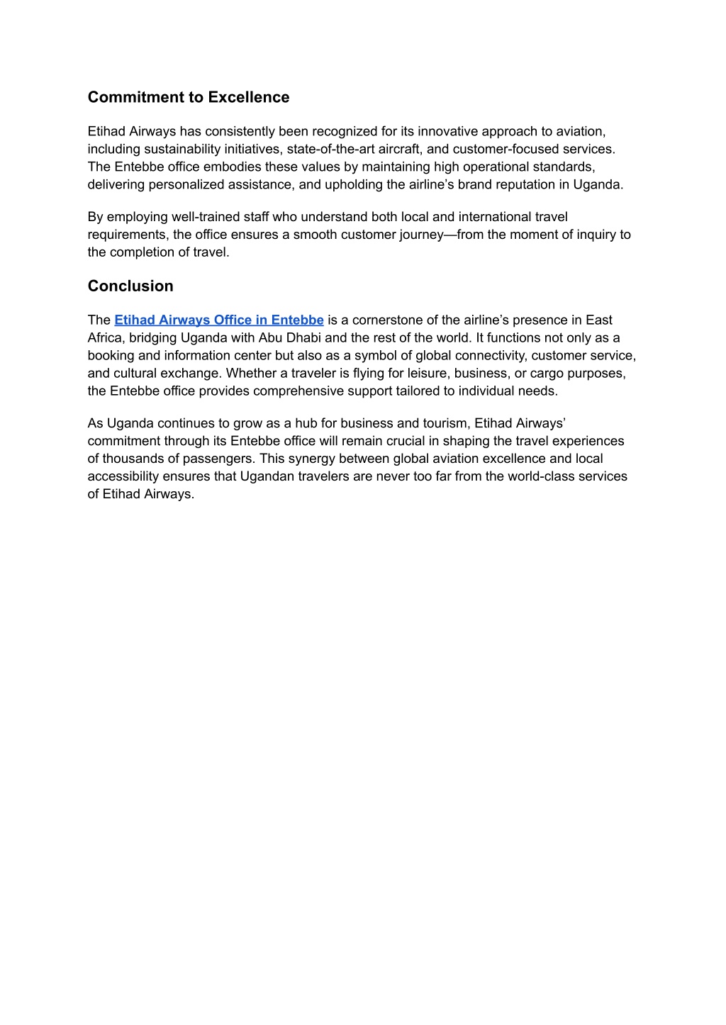 Commitment to Excellence Etihad Airways has consistently been recognized for its innovative approach to aviation, including sustainability initiatives, state-of-the-art aircraft, and customer-focused services. The Entebbe office embodies these values by maintaining high operational standards, delivering personalized assistance, and upholding the airline’s brand reputation in Uganda. By employing well-trained staff who understand both local and international travel requirements, the office ensures a smooth customer journey—from the moment of inquiry to the completion of travel. Conclusion The Etihad Airways Office in Entebbeis a cornerstone of the airline’s presence in East Africa, bridging Uganda with Abu Dhabi and the rest of the world. It functions not only as a booking and information center but also as a symbol of global connectivity, customer service, and cultural exchange. Whether a traveler is flying for leisure, business, or cargo purposes, the Entebbe office provides comprehensive support tailored to individual needs. As Uganda continues to grow as a hub for business and tourism, Etihad Airways’ commitment through its Entebbe office will remain crucial in shaping the travel experiences of thousands of passengers. This synergy between global aviation excellence and local accessibility ensures that Ugandan travelers are never too far from the world-class services of Etihad Airways.