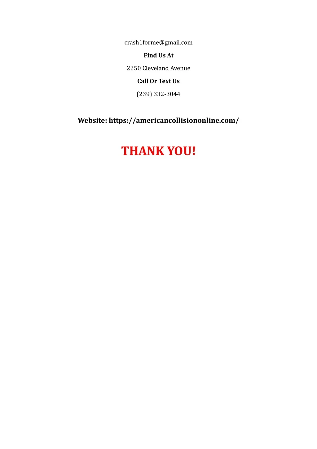 crash1forme@gmail.com Find Us At 2250 Cleveland Avenue Call Or Text Us (239) 332-3044 Website: https://americancollisiononline.com/ THANK YOU!