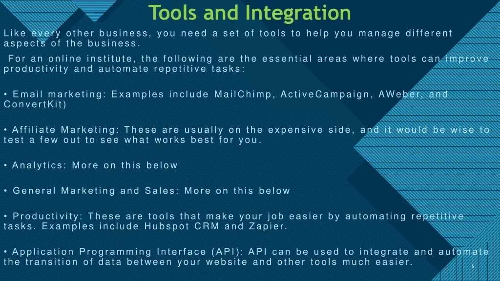 Tools and Integration Like every other business, you need a set of tools to help you manage different aspects of the business. For an online institute, the following are the essential areas where tools can improve productivity and automate repetitive tasks: • Email marketing: Examples include MailChimp, ActiveCampaign, AWeber, and ConvertKit) • Affiliate Marketing: These are usually on the expensive side, and it would be wise to test a few out to see what works best for you. • Analytics: More on this below • General Marketing and Sales: More on this below • Productivity: These are tools that make your job easier by automating repetitive tasks. Examples include Hubspot CRM and Zapier. • Application Programming Interface (API): API can be used to integrate and automate the transition of data between your website and other tools much easier.
