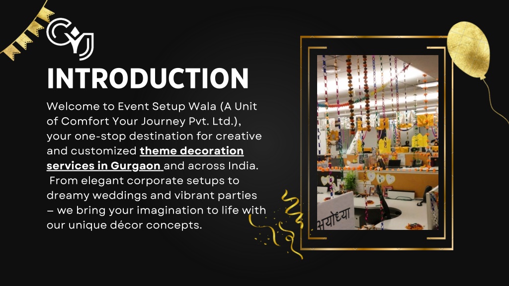 INTRODUCTION Welcome to Event Setup Wala (A Unit of Comfort Your Journey Pvt. Ltd.), your one-stop destination for creative and customized theme decoration services in Gurgaon and across India. From elegant corporate setups to dreamy weddings and vibrant parties — we bring your imagination to life with our unique décor concepts.