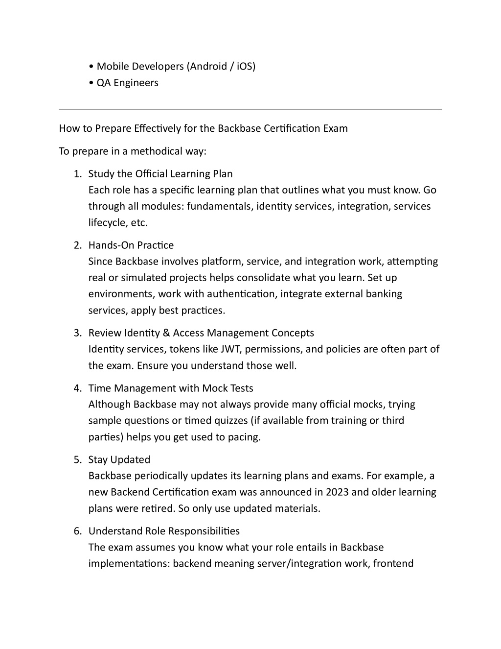 • Mobile Developers (Android / iOS) • QA Engineers How to Prepare Effectively for the Backbase Certification Exam To prepare in a methodical way: 1.Study the Official Learning Plan Each role has a specific learning plan that outlines what you must know. Go through all modules: fundamentals, identity services, integration, services lifecycle, etc. 2.Hands-On Practice Since Backbase involves platform, service, and integration work, attempting real or simulated projects helps consolidate what you learn. Set up environments, work with authentication, integrate external banking services, apply best practices. 3.Review Identity & Access Management Concepts Identity services, tokens like JWT, permissions, and policies are often part of the exam. Ensure you understand those well. 4.Time Management with Mock Tests Although Backbase may not always provide many official mocks, trying sample questions or timed quizzes (if available from training or third parties) helps you get used to pacing. 5.Stay Updated Backbase periodically updates its learning plans and exams. For example, a new Backend Certification exam was announced in 2023 and older learning plans were retired. So only use updated materials. 6.Understand Role Responsibilities The exam assumes you know what your role entails in Backbase implementations: backend meaning server/integration work, frontend
