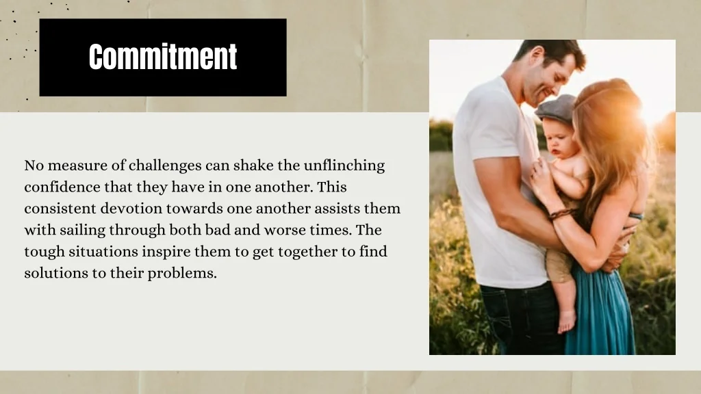Commitment No measure of challenges can shake the unflinching confidence that they have in one another. This consistent devotion towards one another assists them with sailing through both bad and worse times. The tough situations inspire them to get together to find solutions to their problems.